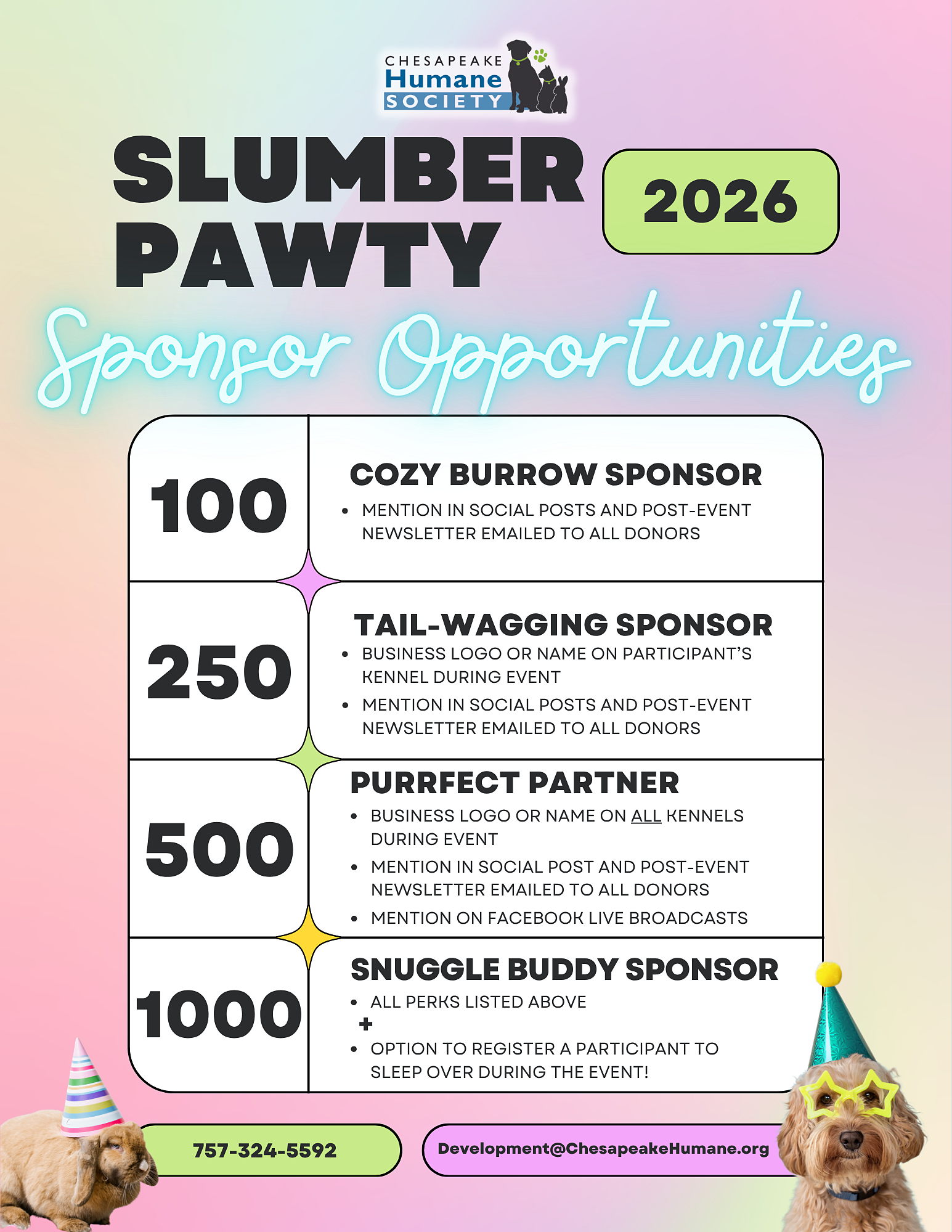 Chesapeake Humane Society IncCage me for a day and Support a GREAT cause! 2026 Chesapeake Humane Society Slumber Pawty!